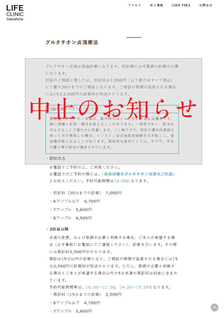 そのためグルタチオン点滴の受付を一時中止とさせていただきます。
